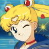 Description: a young girl sitting with her fist up to her chin, her face turned away, ringed by a blue crescent