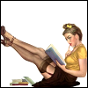 Description: a woman leaning against a wall, reading a book held in hand, legs raised against opposite wall, showing her garters