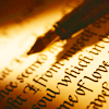 Description: parchment with calligraphy framed in sunlight, a quill-tipped pen atop it